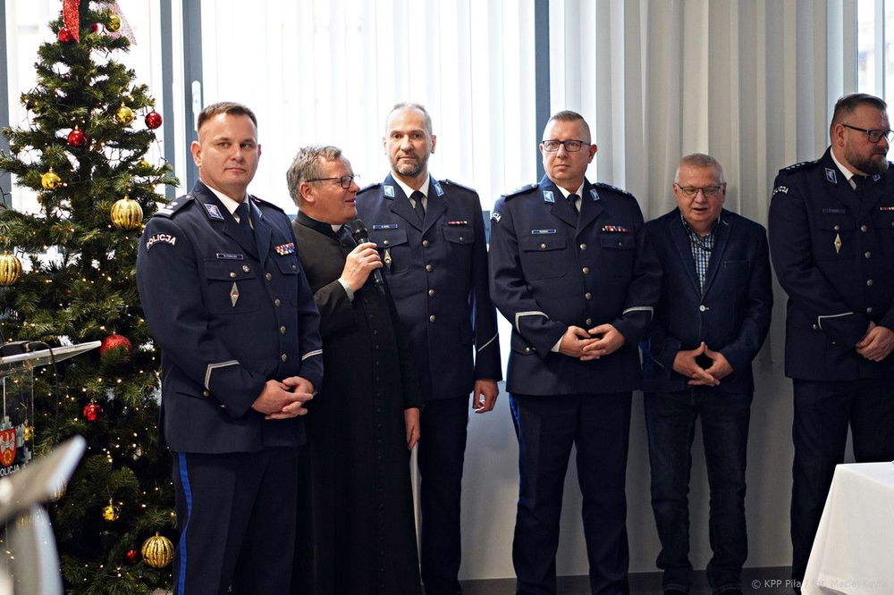 Obecny był również kapelan pilskich policjantów ks. Krzysztof Kowal, który skierował do zebranych świąteczne życzenia. Uroczystą atmosferę podkreśliły kolędy wykonywane na żywo przez policjantów pilskiej jednostki.