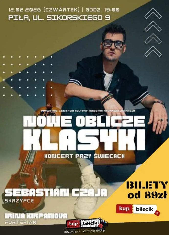Już 12. (czwartek) lutego 2026 roku Piła stanie się stolicą muzyki klasycznej. W "Akademii Rozrywki" przy ul. Sikorskiego 9 odbędzie się niezwykły koncert przy świecach pt. "Nowe oblicze klasyki". Wystąpią wybitni artyści: Sebastian Czaja - skrzypek o imponującym dorobku artystycznym, znany z ekspresyjnych interpretacji i mistrzowskiej techniki, oraz Irina Kirpanova - pianistka o wyjątkowej wrażliwości, znana z subtelności i głębi interpretacji.
