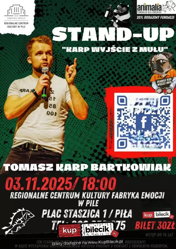 bilety: Nie mam na koncie wielkiego starego programu - ot, kilka wypocin na YouTube - ale po roku robienia stand-upu mogę śmiało powiedzieć jedno: stojąc na scenie, łatwiej mi się śmiać z wami, niż z góry wam mówić, jak żyć. Mój program to spojrzenie człowieka, który wciąż ma w sobie więcej widza niż gwiazdy - co w sumie dobrze, bo przecież ktoś musi wyśmiać współczesny świat, w którym wielu milczy ze strachu o swoją "pozycję" lub po prostu… zwyczajnie brakuje im oleju w głowie. Stand-up: Tomasz "Karp" Bartkowiak artyści: Tomasz BartkowiakTomasz Karp Bartkowiak - człowiek orkiestra: strażak, ratownik, muzyk i stand" uper. Czy da się to wszystko połączyć Zdecydowanie nie! Zresztą sprawdźcie sami! Czy rozgrzeje Was do czerwoności Może przyprawi Was o zawał serca Być może będzie to muzyka dla Waszych uszu Albo po prostu będziecie pękać ze śmiechu! Przekonacie się w pajęczańskim Kinie Świteź! Bilety do nabycia na: KupBilecik.pl |