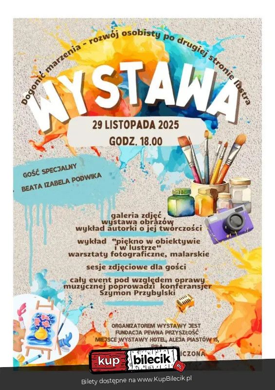 | Wystawadodano 2025-11-24 19:13:15 Gość specjalny Beata Izabela Podwika: Galeria zdjęć, wystawa obrazów, wykład autorki o jej twórczości, wykład "piękno w obiektywie i w lustrze", warsztaty fotograficzne, malarskie, sesje zdjęciowe dla gości, cały event pod względem oprawy muzycznej poprowadzi konferansjer Szymon Przybylski. Organizatorem wystawy jest Fundacja Pewna Przyszłość. Bilety do nabycia na: KupBilecik.plDogonić marzenia- rozwój osobisty po drugiej stronie lustra artyści: Beata Izabela PodwikaGość specjalny Beata Izabela Podwika: Galeria zdjęć, wystawa obrazów, wykład autorki o jej twórczości, wykład "piękno w obiektywie i w lustrze", warsztaty fotograficzne, malarskie, sesje zdjęciowe dla gości, cały event pod względem oprawy muzycznej poprowadzi konferansjer Szymon Przybylski. Bilety do nabycia na: KupBilecik.pl |